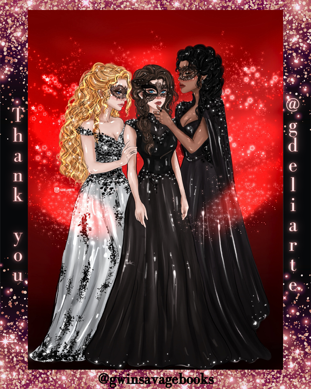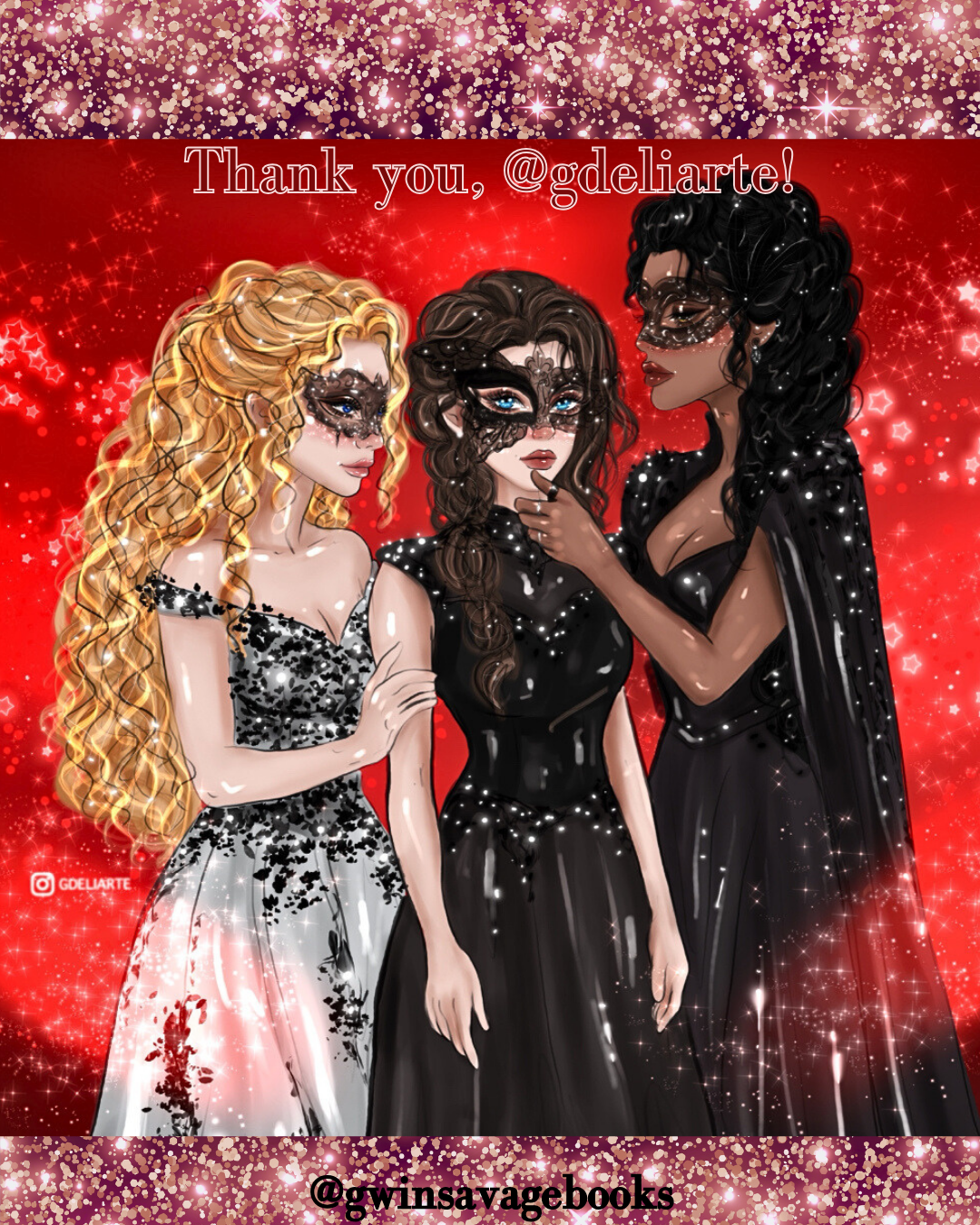 Sadrie, Tiss, and Elodie in their gowns and masks during the Feast of First Night (Ch 36-38) by @gdeliarte.