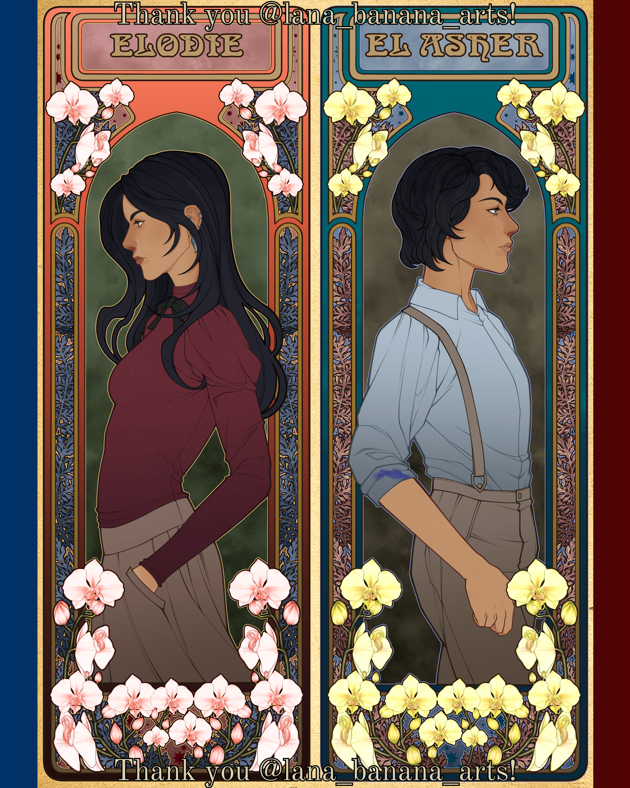 ➣ Elodie in everyday clothes & El Asher from the first scene in Ch 44. You may notice a streak of ultramarine paint on the rolled cuff of his sleeve. IYKYK! A brat’s gotta mark her territory, and I couldn’t resist having the artist add in that detail.